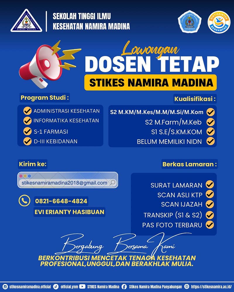 [ LOWONGAN DOSEN TETAP STIKes NAMIRA MADINA ] #stikesnamiramadina #namiramadinapanyabungan #kampusbiru #farmasi #kebidanan #dprdpanyabungan #bemstikesnamira #mandailingnatal #mandailingpopuler #gunungtualumbanpasir #instagram #feedinstagram #panyabunganhits